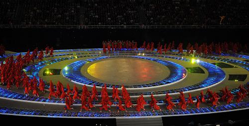 10月28日,第十一届全国运动会闭幕式在山东济南举行。这是闭幕式上的武术表演《燃烧》。