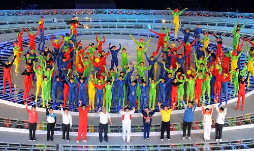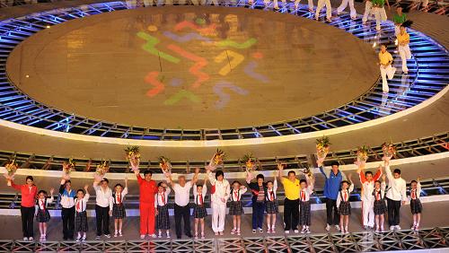 10月28日,第十一届全国运动会闭幕式在山东济南举行。这是闭幕式上历届全运会冠军(前排)向观众致意。 新华社记者王长山摄