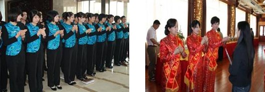 左图:静雅大酒店服务员练习“和谐全运”手礼,右图:济南珍珠泉宾馆膳艺师以“和谐全运”手礼迎宾。