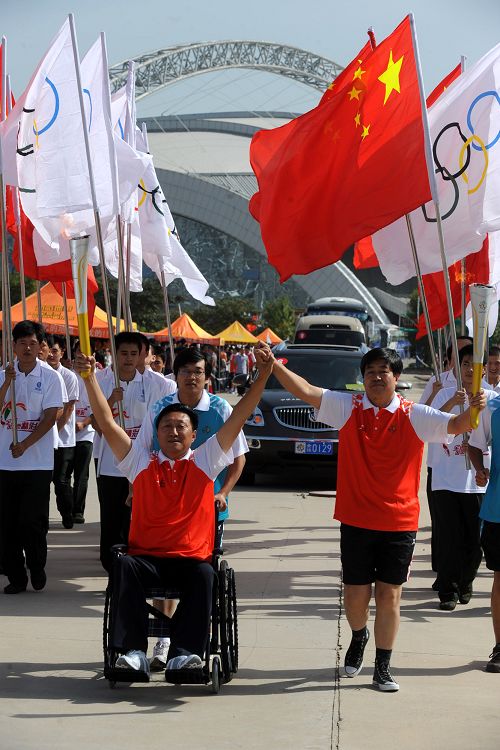 9月21日,两名火炬手在同时传递火炬。当日,第十一届全国运动会火炬传递活动在山东省烟台市举行。 新华社记者 韩瑜庆摄