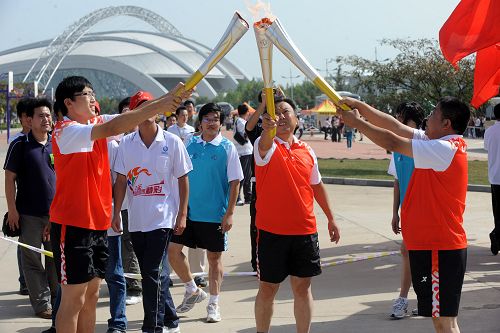 9月21日,奥运冠军邢傲伟(左)点燃第二棒火炬手的火炬。当日,第十一届全国运动会火炬传递活动在山东省烟台市举行。 新华社记者 韩瑜庆摄