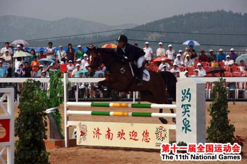山东队队员在比赛中(吴哲 摄) 十一运会官方网站济南6月14日讯 今天下午,“好客山东”十一运会马术测试赛暨2009年全国马术三项赛冠军赛在济南国际赛马场圆满结束。经过三天的角逐,广东队获得团体赛冠军,东道主山东队获得第三名;在个人赛比赛中,广东队的梁锐基、李静敏和马裕兴包揽了前三名,山东队的宝音德力根获得第五名,“弟弟”宝音套格图获得第八名。
