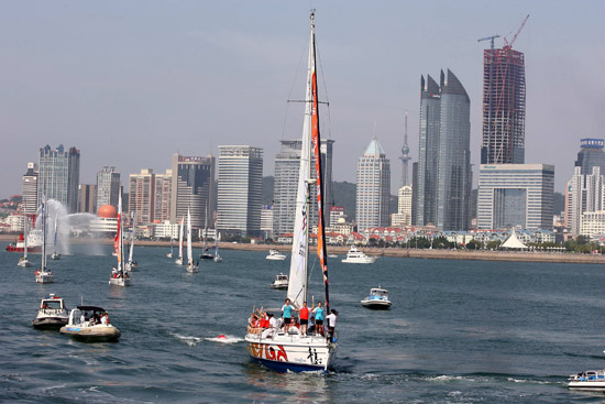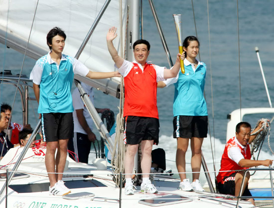 十一运官网讯 9月19日,全运会火炬接力山东省第一站在青岛市举行,145名选手参加了火炬接力。火炬接力路线包括路上和海上两部分,其中奥运射箭冠军张娟娟参加了第一棒接力。记者 王鸿光 摄